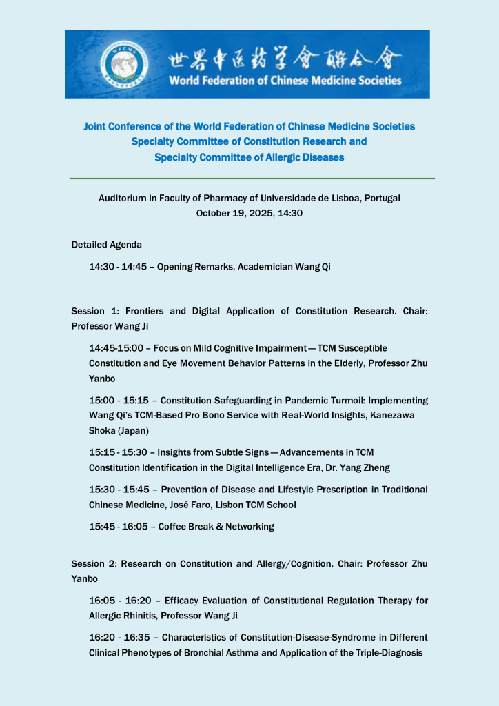 Pode inscrever-se para participar no nosso Fórum 2025 de Medicina Tradicional e no Congresso da WFCMS sobre Investigação da Constituição e Doenças Alérgicas. A entrada é gratuita, mas a inscrição é obrigatória.PData:2025.10.18 e 2025. 10. 19Local:Auditoiro da Faculdade de Farmácia da Universidade de Lisboa (FFUL)